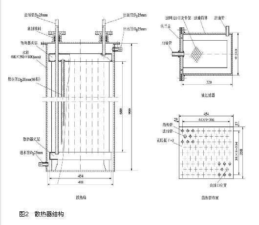 熱天入磨熟料溫度過高,經(jīng)常被迫停機。2001年自制了2臺散熱器,對主軸承潤滑采用“體外循環(huán)”強迫冷卻的方式,如圖1。將油從原來油池上面的油位觀察孔中引出,進入1個特制的散熱器中,見圖2。86根鋼管均勻分布組成散熱管排,上下由夾層箱匯通,然后浸入循環(huán)水水箱中。高溫油經(jīng)過濾器過濾后進入散熱器下端夾層箱,隨著齒輪油泵的抽力,熱油在86根管中緩緩上升,將部分熱量傳給涼水帶走,因而起到了降溫作用。分別安裝在2臺水泥磨的出料中空軸瓦上,軸瓦升溫到55℃時,散熱系統(tǒng)起動,待2~3min后,溫度便降到了48℃以下,保持不升不降。涼爽天瓦溫不高,就不必起動散熱系統(tǒng),仍依靠原來油圈帶油潤滑,使用靈活方便,1年多再沒有因磨機軸瓦溫度過高而停機
