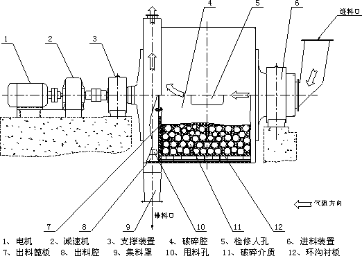 概況1.1傳統(tǒng)粉磨電耗高的原因分析 1.2礦渣粉磨升級(jí)技術(shù)改造 南京旋立粉磨技術(shù)研究所經(jīng)過(guò)多年技術(shù)攻關(guān),成功開(kāi)發(fā)一種適應(yīng)礦渣預(yù)粉磨的高效能設(shè)備-FM-Ⅱ型風(fēng)選磨,利用大球滾動(dòng)擠壓破碎理論,充分發(fā)揮礦渣易碎特點(diǎn),徹底解決礦渣的破碎問(wèn)題,達(dá)到半終粉磨效果,出風(fēng)選磨粒度0.08mm篩余在30-40%,95%小于1mm,這樣進(jìn)入管磨粉磨,粉磨效率大大提高,可增產(chǎn)50-60%,電耗降低10-15kwh,比表提高30-50m2/kg。同時(shí),兩段分別粉磨工藝將徹底解決管磨機(jī)受礦渣水分的嚴(yán)重影響,目前,許多廠(chǎng)家仍然采用立式烘干機(jī)烘礦渣,由于立式烘干機(jī)烘干水分不穩(wěn)定,礦渣磨影響很大。入磨礦渣水分大了,易糊段和篩板,影響生產(chǎn);水分小了,易產(chǎn)生高溫靜電“包球”現(xiàn)象,同樣也影響生產(chǎn)。采用兩段分別粉磨,可徹底解決水分對(duì)礦渣的影響,由于風(fēng)選磨單獨(dú)除塵,水蒸氣經(jīng)風(fēng)選磨及時(shí)排出,不進(jìn)入后道工序,不影響礦磨生產(chǎn),這樣就解決了礦渣水分對(duì)礦磨的影響,并可適當(dāng)放寬礦渣水分1-2%,可節(jié)省烘干成本。由于進(jìn)入礦磨物料又是半終粉磨產(chǎn)品,因此管磨效率大大提高,產(chǎn)量高,流速加快,可降低出磨物料溫度20-30℃,將有利于磨機(jī)的正常生產(chǎn)。 2 關(guān)鍵技術(shù) 球磨機(jī)的高產(chǎn)低能耗是每一個(gè)用戶(hù)所追求的理想目標(biāo)。要實(shí)現(xiàn)球磨機(jī)的高產(chǎn)和低能耗就必須發(fā)揮球磨機(jī)粉磨的最大效能,物料在球磨機(jī)中完成被破碎和研磨的工藝作業(yè),因而高效能的球磨機(jī)必定有高效率的破碎和高效率的研磨作業(yè),如何實(shí)現(xiàn)高效率的破碎和高效率的研磨是進(jìn)行傳統(tǒng)粉磨系統(tǒng)改造的關(guān)鍵!捌颇ト蛛x”傳統(tǒng)粉磨技術(shù)改造由兩項(xiàng)關(guān)鍵技術(shù)組成:以破代磨;破磨分離!∫云拼 以破代磨是目前提高球磨機(jī)粉磨效率的有效途徑。球磨機(jī)雖然采用分倉(cāng),但由于破碎倉(cāng)和研磨倉(cāng)是共用一個(gè)筒體,在結(jié)構(gòu)上和運(yùn)動(dòng)上都不能分開(kāi),要實(shí)現(xiàn)破碎和研磨的最佳運(yùn)動(dòng)形式是不可能的,而球磨機(jī)是以研磨作業(yè)為主的,因此將主要的破碎作業(yè)從球磨機(jī)中分離出來(lái),這樣可以分別使破碎和粉磨效率最大化。選用風(fēng)選磨是以破代磨最佳方案。 破磨分離 破磨全分離是管磨機(jī)在分倉(cāng)粉磨作業(yè)中,破碎和研磨作業(yè)的一種實(shí)現(xiàn)方式。這種實(shí)現(xiàn)方式,打破長(zhǎng)期以來(lái)管磨機(jī)在分倉(cāng)粉磨作業(yè)中細(xì)磨倉(cāng)破碎和研磨需要兼顧的觀念,改變細(xì)磨倉(cāng)要兼顧破碎和研磨的研磨體級(jí)配要求,通過(guò)嚴(yán)格的隔倉(cāng)篩分,使得細(xì)磨倉(cāng)不需要破碎作業(yè),僅需研磨,以便能夠?qū)崿F(xiàn)真正的微介質(zhì)研磨,以提高管磨機(jī)的粉磨效能!∫云拼ゴ蠓葴p小了球磨機(jī)對(duì)破碎作業(yè)的要求,接下來(lái)就是如何利用球磨機(jī)對(duì)經(jīng)過(guò)風(fēng)選磨預(yù)處理的水泥熟料進(jìn)行高效率的粉磨。因經(jīng)過(guò)風(fēng)選磨預(yù)粉磨的物料盡管大部分物料已成粉狀,但仍有少量粗顆粒,在球磨機(jī)中還不能完全采用微介質(zhì)實(shí)現(xiàn)高效粉磨,球磨機(jī)仍需分為兩倉(cāng),對(duì)進(jìn)入球磨機(jī)的部分粗顆粒仍需破碎作業(yè)來(lái)完成。粗磨倉(cāng)中應(yīng)具有粉料流速快,讓細(xì)粉盡快進(jìn)入細(xì)磨倉(cāng)同時(shí)留下粗顆粒的效能;細(xì)磨倉(cāng)采用具有高比表的微介質(zhì)粉磨,同時(shí)要求嚴(yán)格控制進(jìn)入細(xì)磨倉(cāng)的粉料粒徑大小,以實(shí)現(xiàn)破磨分離作業(yè)的要求。 3 工藝示意圖 4 主要產(chǎn)品 4.1結(jié)構(gòu)示意圖 4.2主要性能特點(diǎn)●高可靠性 低速運(yùn)行,新穎獨(dú)特結(jié)構(gòu)設(shè)計(jì),無(wú)任何機(jī)械故障!竦拖男 鋼球破碎,磨耗小,鋼球磨小后可作磨機(jī)級(jí)配用,無(wú)浪費(fèi)!翊笃扑楸 破碎比特大,細(xì)粉含量多,結(jié)合破碎與研磨功能!裥」谋 破碎效率高,功率消耗低,無(wú)功浪費(fèi)少!襁m應(yīng)性強(qiáng) 鐵塊入機(jī)無(wú)影響,無(wú)需專(zhuān)用除鐵器;入機(jī)物料水分可適當(dāng)放寬!裢ㄓ眯詮(qiáng) 除水泥行業(yè)、還可用于冶金、礦山、化工等高硬度物料超細(xì)破碎用。 ----------------------------------------------------------------------------------------------